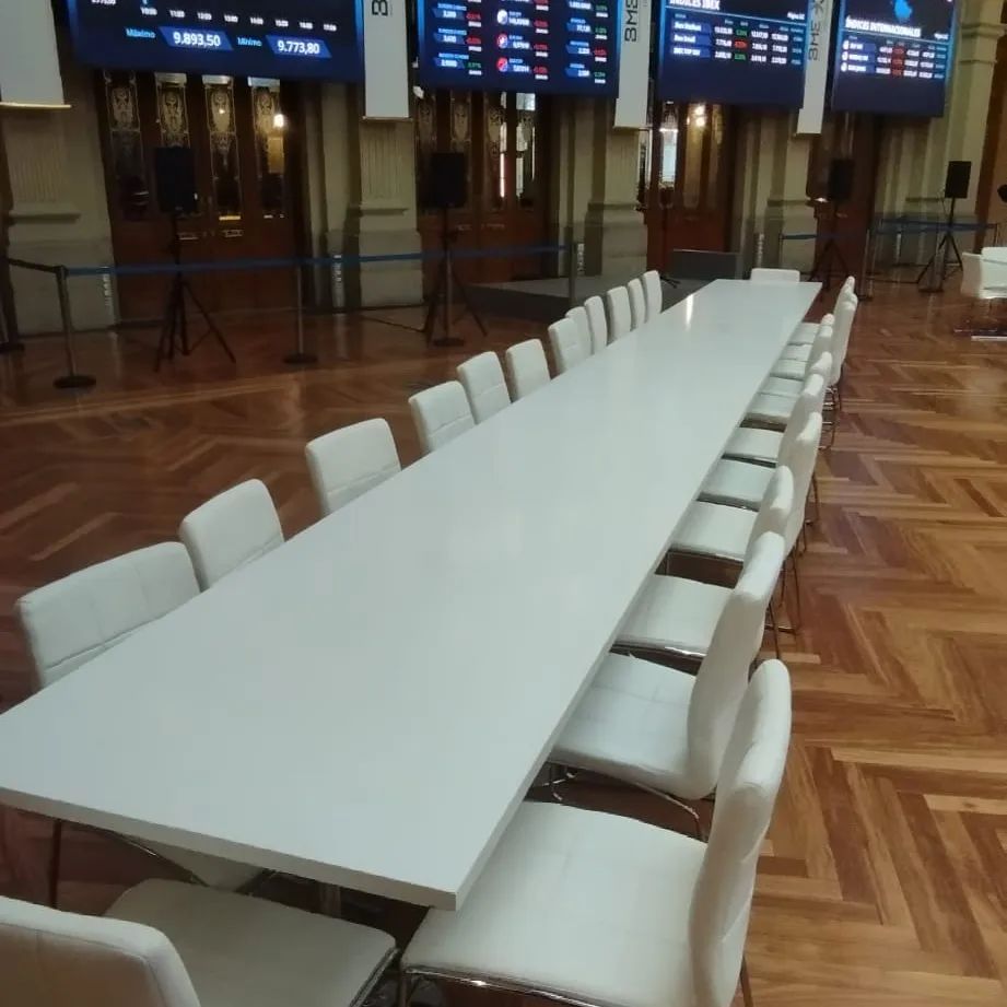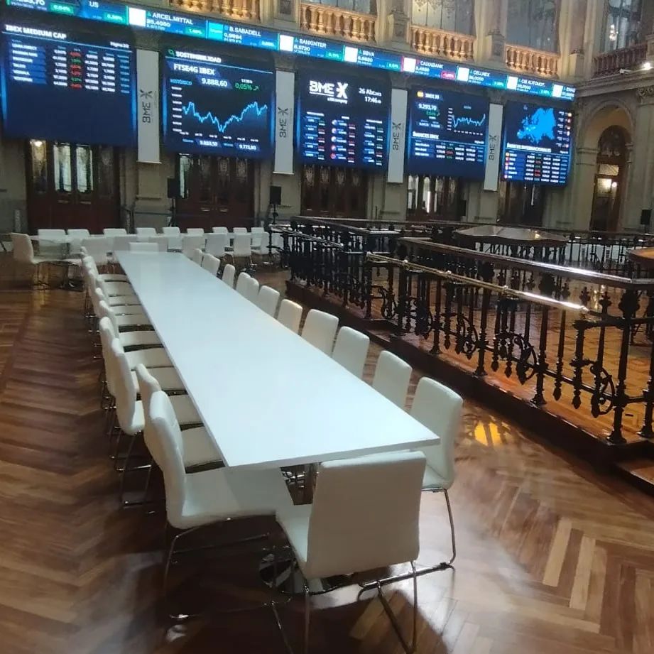 Una combinación perfecta, nuestras mesas modelo Brasilia y sillas Urzi en un entorno singular, la Bolsa de Madrid.
